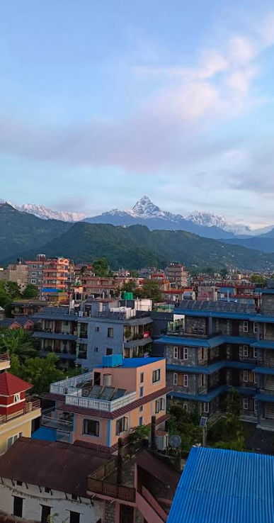 Wake up to golden skies, misty waters, and the Annapurna reflections — a serene experience for travelers seeking peaceful mornings and breathtaking scenery from CrystalFall Hotel.